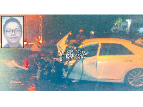 死者張育賓(小圖)駕駛的豐田轎車前部毀壞不堪,可見當時衝擊力極大。